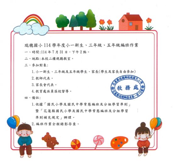 本校訂於7/31下午2點舉行小一新生 三年級 五年級編班作業