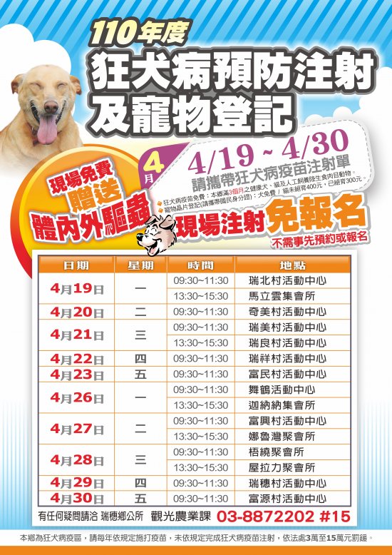 五、檢附本鄉「110年狂犬病疫苗及寵物登記巡迴注射」海報1份,請協助張貼 。