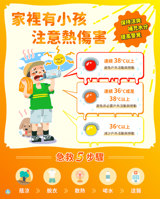 四、相關資訊可逕至國健署「預防熱傷害衛教專區」參閱,網址:https://www.hpa.gov.tw/Pages/List.aspx?nodeid=440,另宣導單張放置「教育部學校衛生資訊網」,可逕至該網站下載運用,網址:https://cpd.moe.gov.tw/article.php?ctid=274。