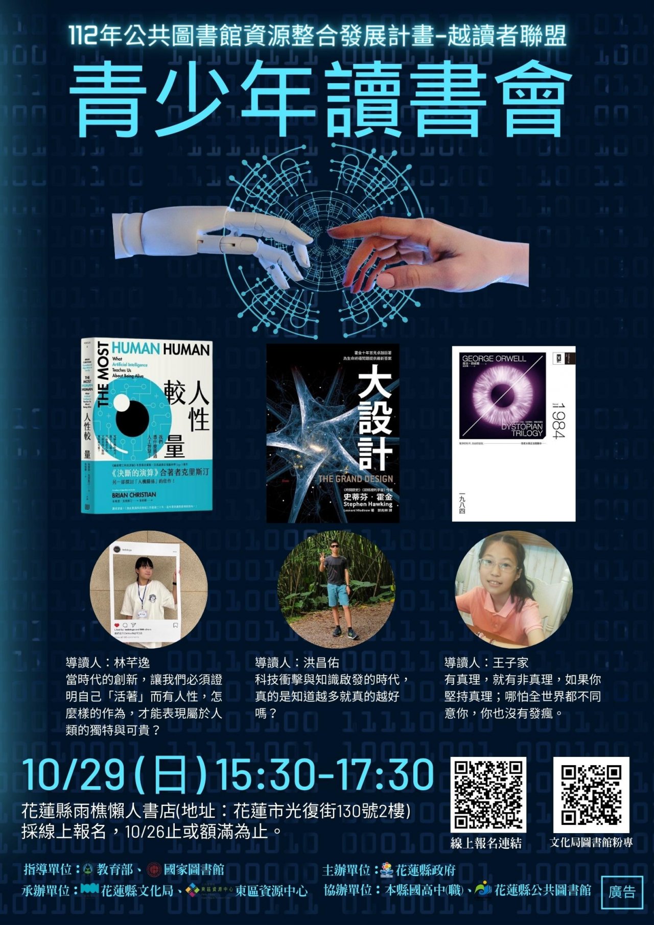 | (四) | 導讀書籍:林芊逸《人性較量:我們憑什麼勝過人工智慧?》、王子家《 1984 》、洪昌佑《大設計》。 |