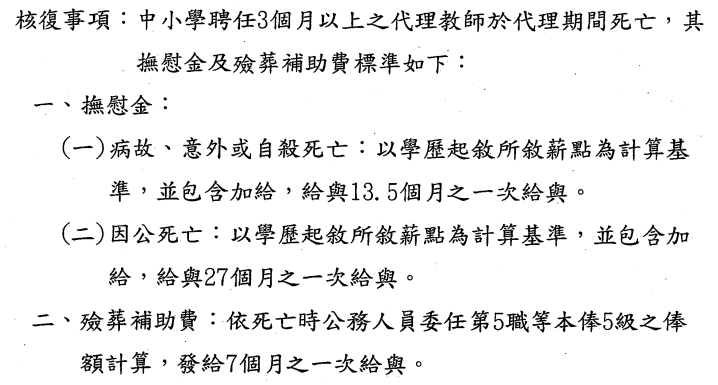 | 主旨: | 有關中小學聘任 3 個月以上代理教師於代理期間死亡,比照「行政院與所屬中央及地方各機關約僱人員僱用辦法」規定,發給遺族撫慰金及殮葬補助費一案,轉請查照。 |