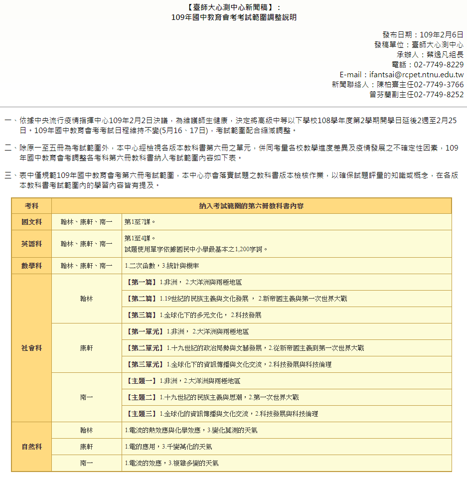二、因應嚴重特殊傳染性肺炎疫情致國中延後2週開學,109年國中教育會考考試日程維持不變(109年5月16、17日),考試範圍配合縮減調整。除原一至五冊為考試範圍外,有關109年國中教育會考調整各考科第六冊教科書納入考試範圍之內容,國立臺灣師範大學業於109年2月6日公布於國中教育會考網站(https://cap.nace.edu.tw/),請轉知所屬學校參閱。