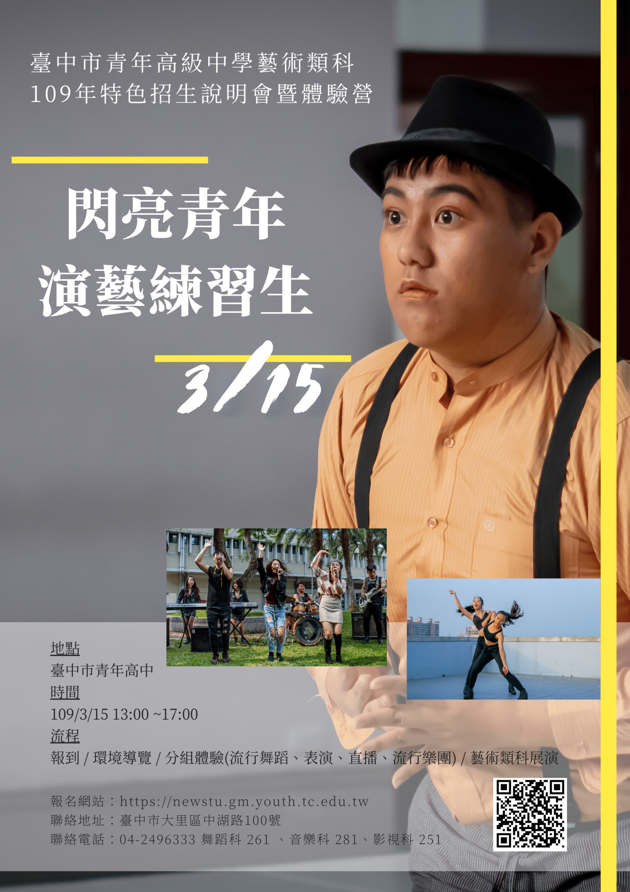 一、 為讓國中即將畢業的同學能搶先體驗本校藝術類科學習內容與 109 年特色招生甄選內容,本校特別辦理「閃亮青年 演藝練習生」活動營隊並邀請 109 學年國三生或欲升學高中職的同學報名參加。