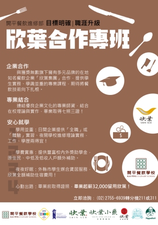 為使更多國中學生對技職教育深入瞭解,辦理理念說明會,提供學生、家長及教育同業,認識教育理念與餐飲教學特色,特訂109年04月18日(星期六)上午於辦理理念說明會(如附件一),亦於109學年度增設與欣葉餐飲集團合作之「欣葉專班」(如附件二),提供實務導向之學生能將職場訓練及學歷進修雙軌並行,並提供費用全額補助之校外賃居服務。惠請貴校轉知所屬學生,歡迎有興趣的同學及家長填寫報名表傳真或至官網: http://bit.ly/2019kpcs 線上報名;亦可來電洽詢聯合服務室(02)2755-6939分機211或311。