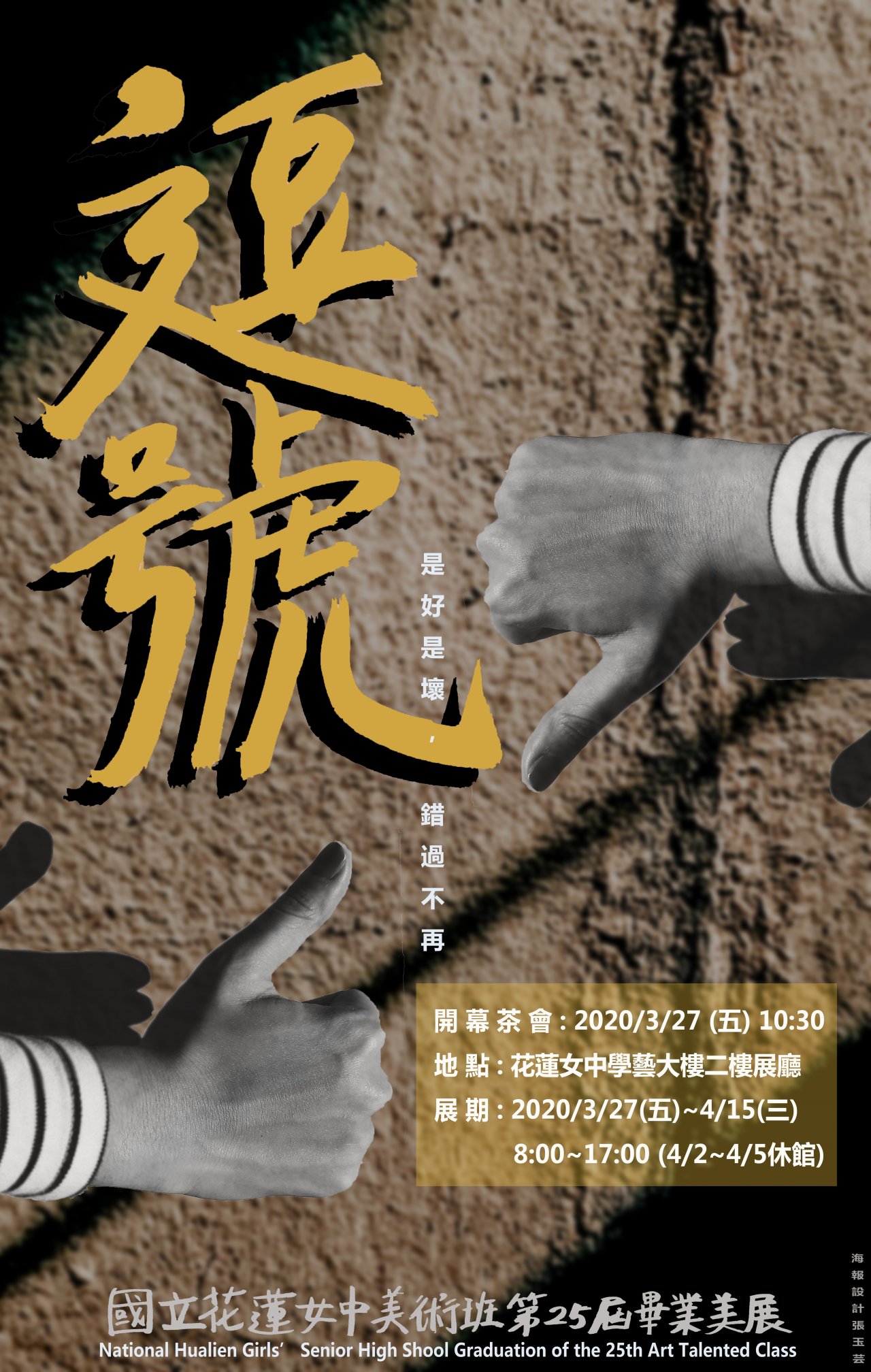 一、 108 學年度美術班畢業美展展期為 3/27 (五)至 4/15 (三),參觀時間為每日 8:00~17:00 ; 4/2 (四)至 4/5 (日)休館。 二、 因應嚴重特殊傳染性肺炎疫情,本屆開幕典禮僅開放校內師生及家長參加;校外人士可於展期間至本校參觀,惟進入校園須配合規定,於大門口傳達室量測體溫並配戴口罩。 三、 海報及邀請卡詳附件。