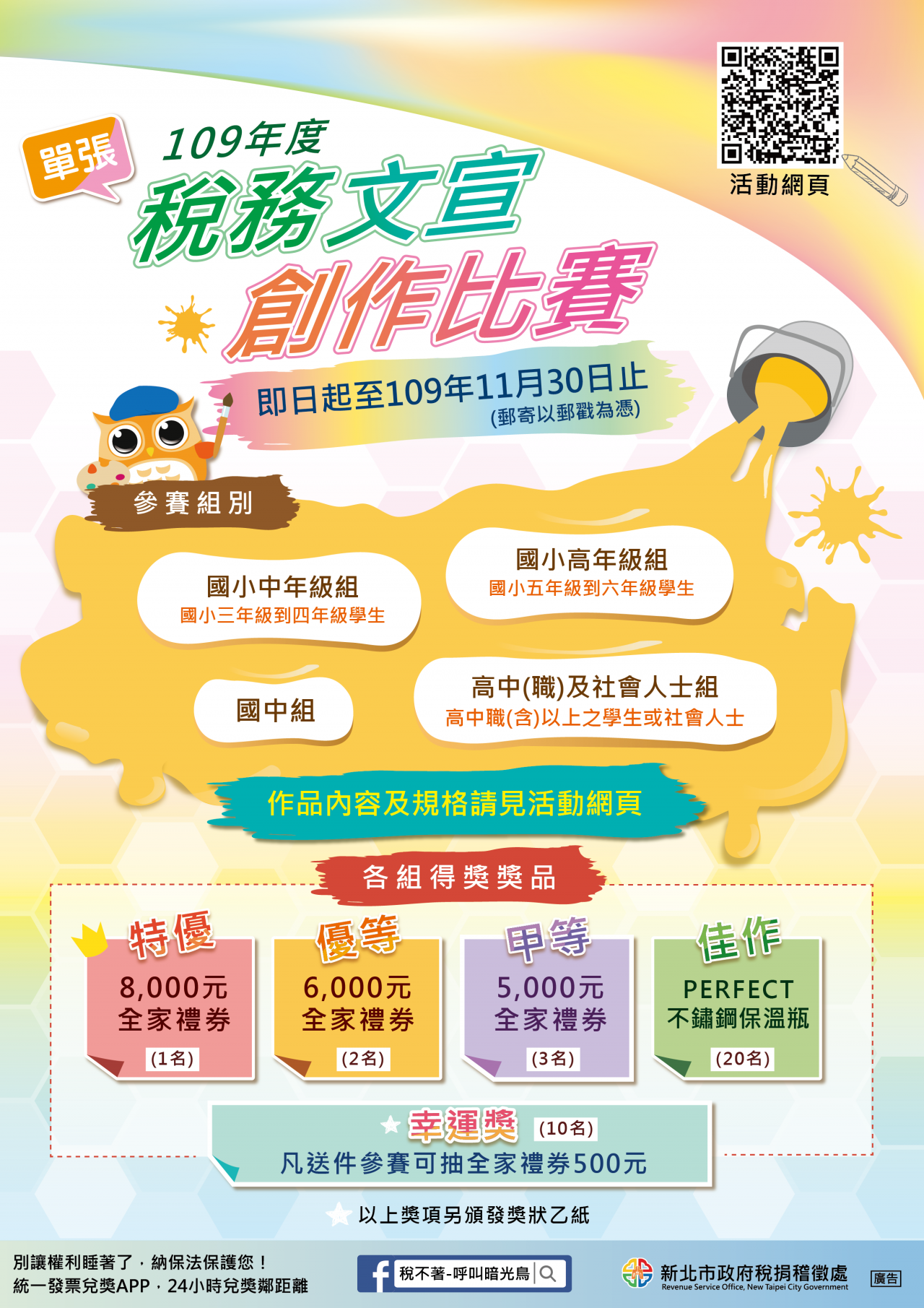 | 二、 | 檢附本處 109 年度稅務文宣創作比賽活動辦法、 DM 、 Banner 電子檔如附件。(活動網址: https://www.tax.ntpc.gov.tw/cp-63-11207-0d211-1.html) |