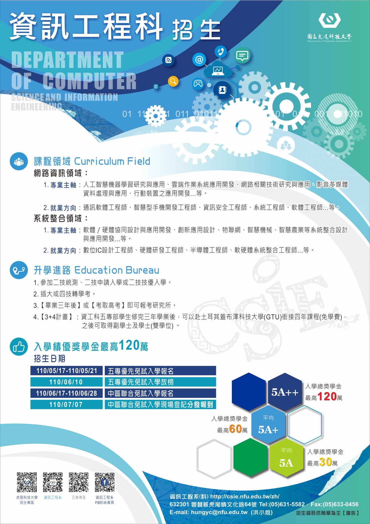 | 二、 | 該校資訊工程系五專學制「資訊工程科」將於 110 學年度招收新生,名額共計 40 名。 |