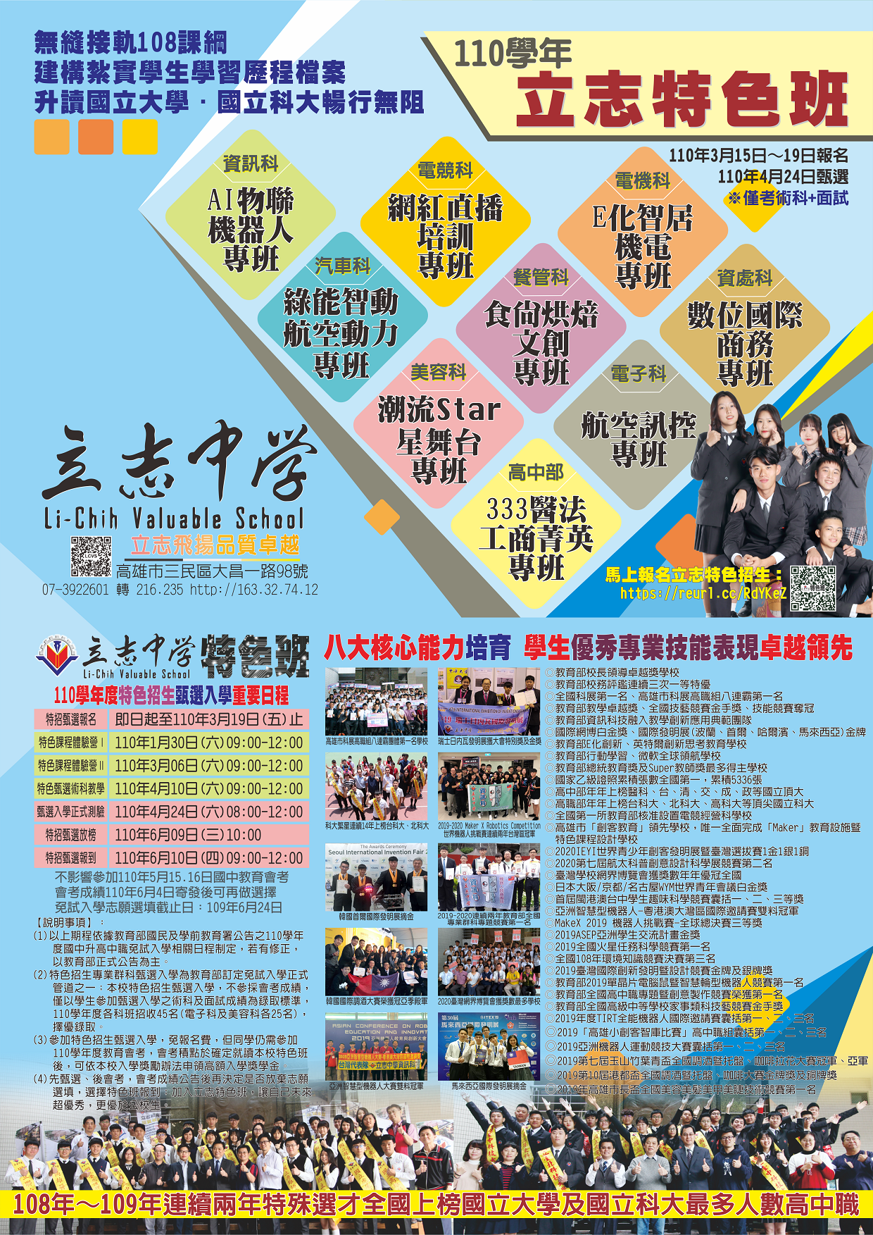 立志學校財團法人高雄市立志高級中學110學年度高級中等學校特色招生專業群科甄選入學簡章、術科測驗內容及海報