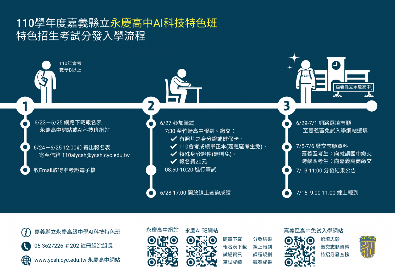 | 四、 | 其它最新消息,請至該二校特色招生網站(竹崎高中:http://163.27.118.93/ai/index.php ,永慶高中:http://www.ycsh.cyc.edu.tw/modules/tad_web/index.php?WebID=2)查詢。 |