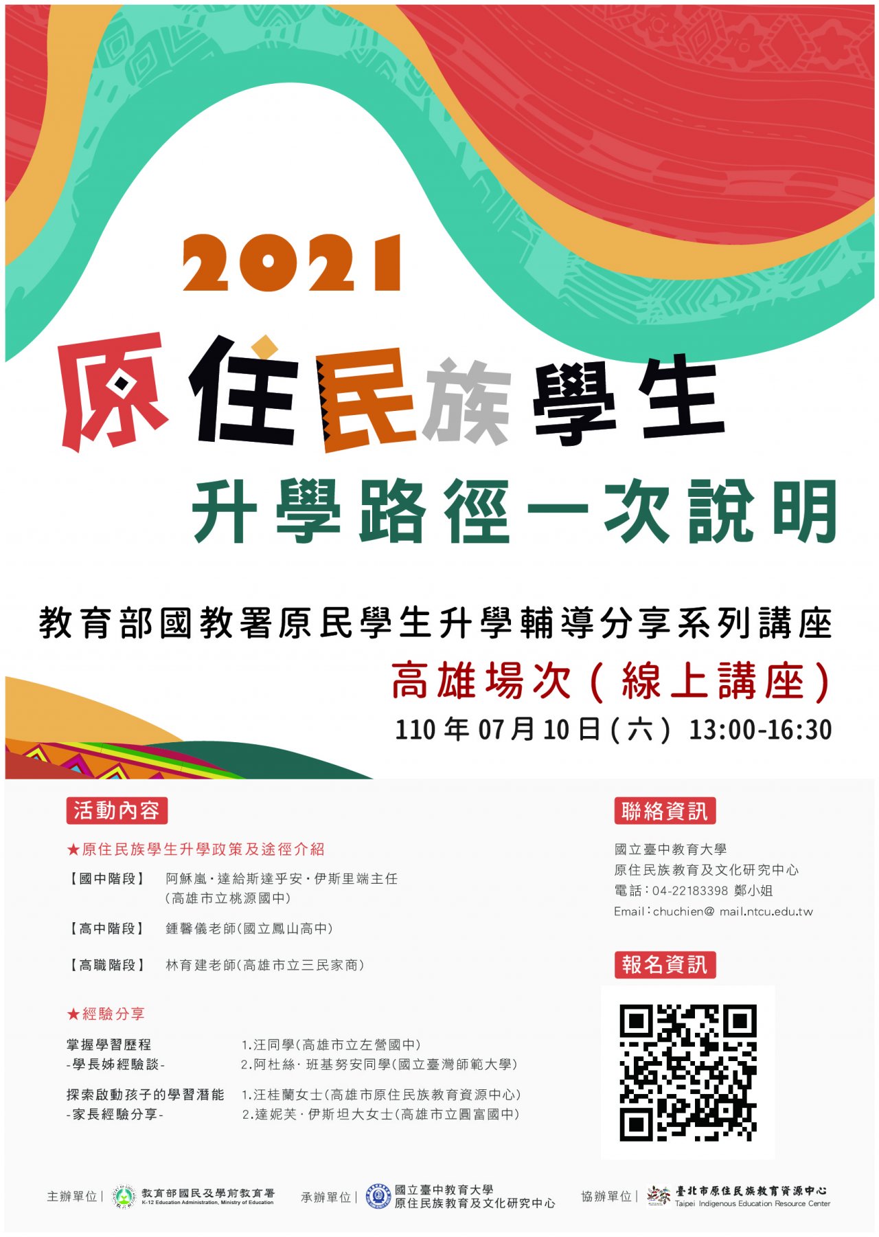 | 二、 | 旨揭講座係由國教署委託該校與高雄市原住民族教育資源中心共同辦理。本次講座以線上方式辦理,邀請講師說明國中、高中職各教育階段原民升學路徑及管道,提供原住民族學生及家長了解相關政策及升學訊息。 |