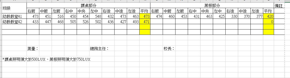 評鑑標準為:室內活動室平均照度至少五百勒克斯(lux)以上,並不得高於七百五十勒克斯(lux)。 但目前兩間教室都不符標準。 (測試結果已夾帶檔案,資料來源為護理師協助測量並提供結果) |
